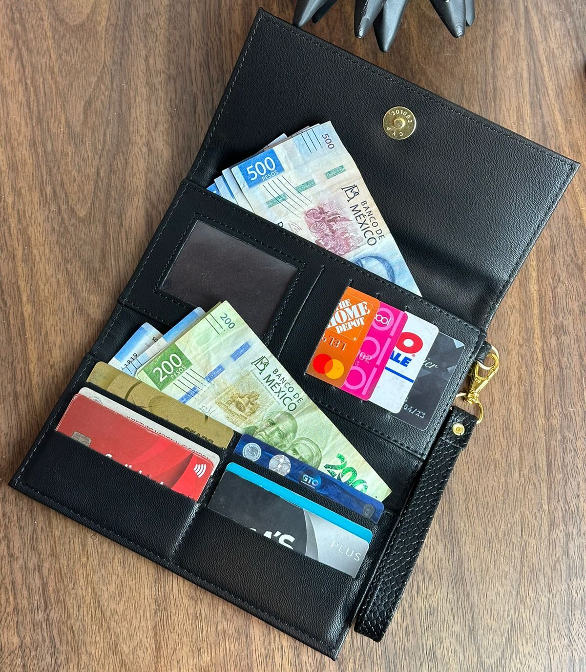Incluye 1 apartados de zíper para monedas al reverso, 11 espacios para tarjetas y dos apartados para billetes.
